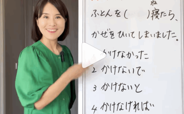 NEW 02/11/2025Quick Japanese LessonChika Sensei [JLPT N4] Without a blanket and…: ふとんを+[かけなかった・かけないで・かけないと・かけなければ]? こんにちは、ちか先生です。 Konnichiwa, it’s Chika Sensei. Today, I’m sharing a practice question for JL […]