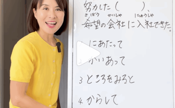 NEW 15/01/2026Quick Japanese LessonChika Sensei [JLPT N2] My hard work paid off: 努力した+[にあたって・かいあって・ところをみると・からして] こんにちは、ちか先生です。 Konnichiwa, it’s Chika Sensei. Today, I’m sharing a practice question for JL […]